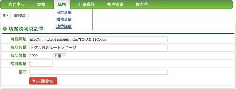 依照項目填入網址、名稱、價格與數量,並依照您的需求進行備註,完成後點選「加入購物車」,