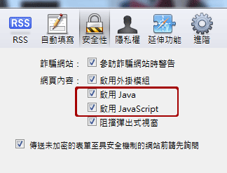 自定义工具栏→偏好设定→安全信→启用Java、启用JavaScript 一同点选→确认