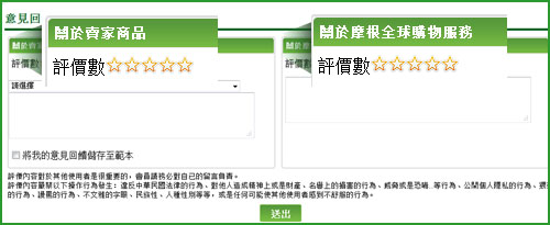 在您的商品狀態為「國內已發貨」時,您的訂單中會出現「意見回饋」的欄位,您可針對賣家商品、摩根全球購物服務進行評價或給予星星,摩根全球購物感謝您的評價與回饋,您的評價將會讓摩根全球購物的服務更為提升。