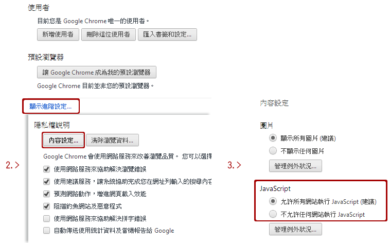 設定→顯示進階設定:內容設定→JavaScript→允許所有網站執行JavaScript→確認