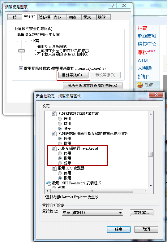 工具→網際網路選項→安全信:(請調至,此區域允許的等級:中到高)→自訂等級→以指令碼執行Java Applet啟用→確認