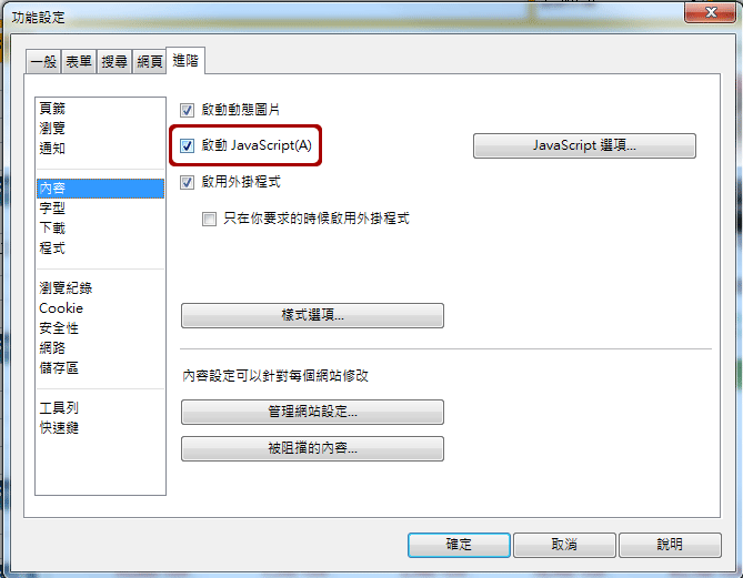 工具→功能設定→進階→內容→啟動JavaScript→確認